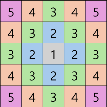// ex. visited 배열 시작 노드 좌표 기준 (3, 3)