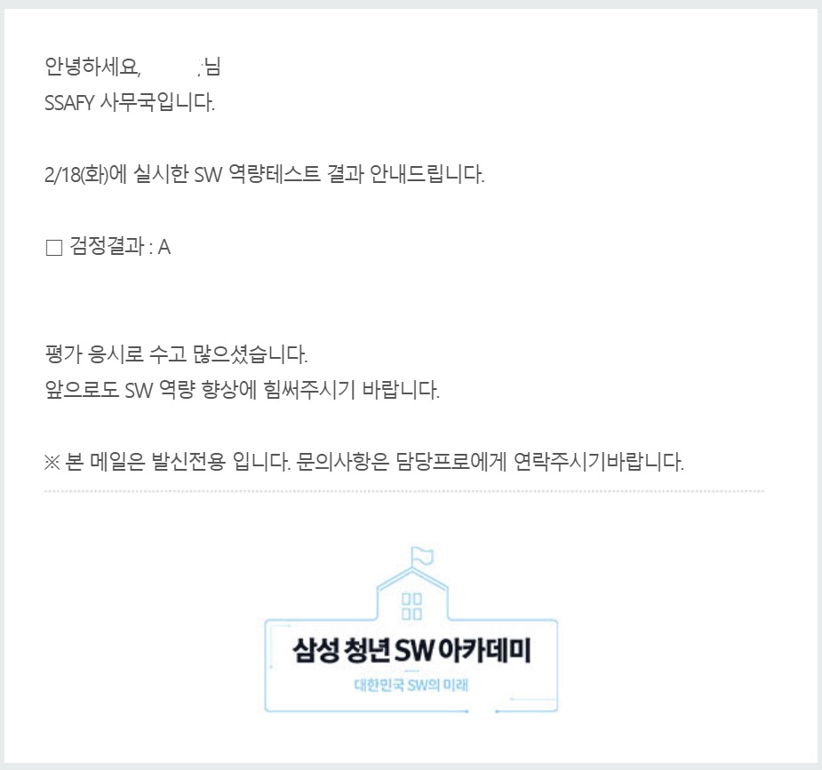 아 그리고 또! 삼성 SW역량평가 A를 달성했다. SSAFY 수료 조건 중에 가장 걱정되었던 부분이 이 부분이었는데, 알고리즘을 학습한 지 한달만에, 그것도 첫 역량평가 시험에서 달성해서 가장 뿌듯한 순간이었다. 코딩테스트를 보려면 알고리즘 공부는 계속 진행해야겠지만, 부담이 하나 사라진 것만으로도 충분하다.