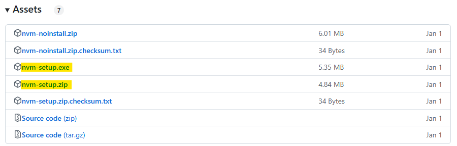 아래 링크에서 NVM for Windows 설치 파일을 다운받는다. 여러 파일 들 중에서 nvm-setup.zip
