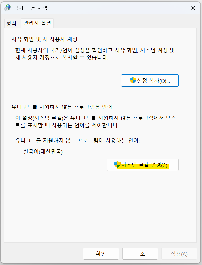 두번째 방법은 윈도우의 문자 인코딩 형식을 변경하는 것이다. 영어의 경우 문제가 없으나, 한글 인코딩 방식에 의해 위 오류가 발생했을 가능성이 높다. 따라서 윈도우의 문자 인코딩 방식을 변경하여 해결하는 것이다.