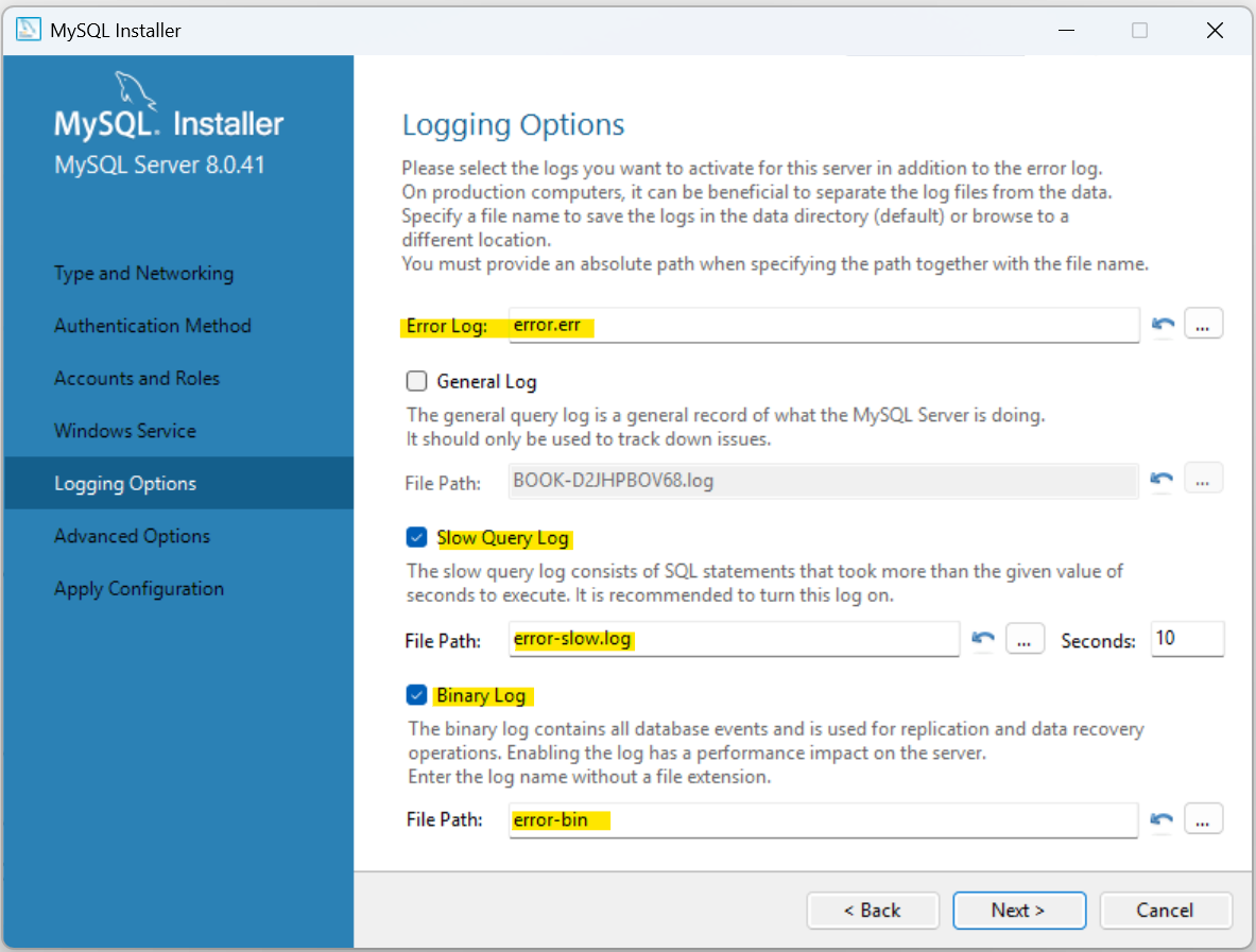 Logging Options 파트에서는 아래와 같이 Slow Query Log와 Binary Log 부분에 체크를 하며, 3가지 경로에 한글이 포함되어 있다면, 원하는 영문자로 변경하고 다음으로 넘어간다.