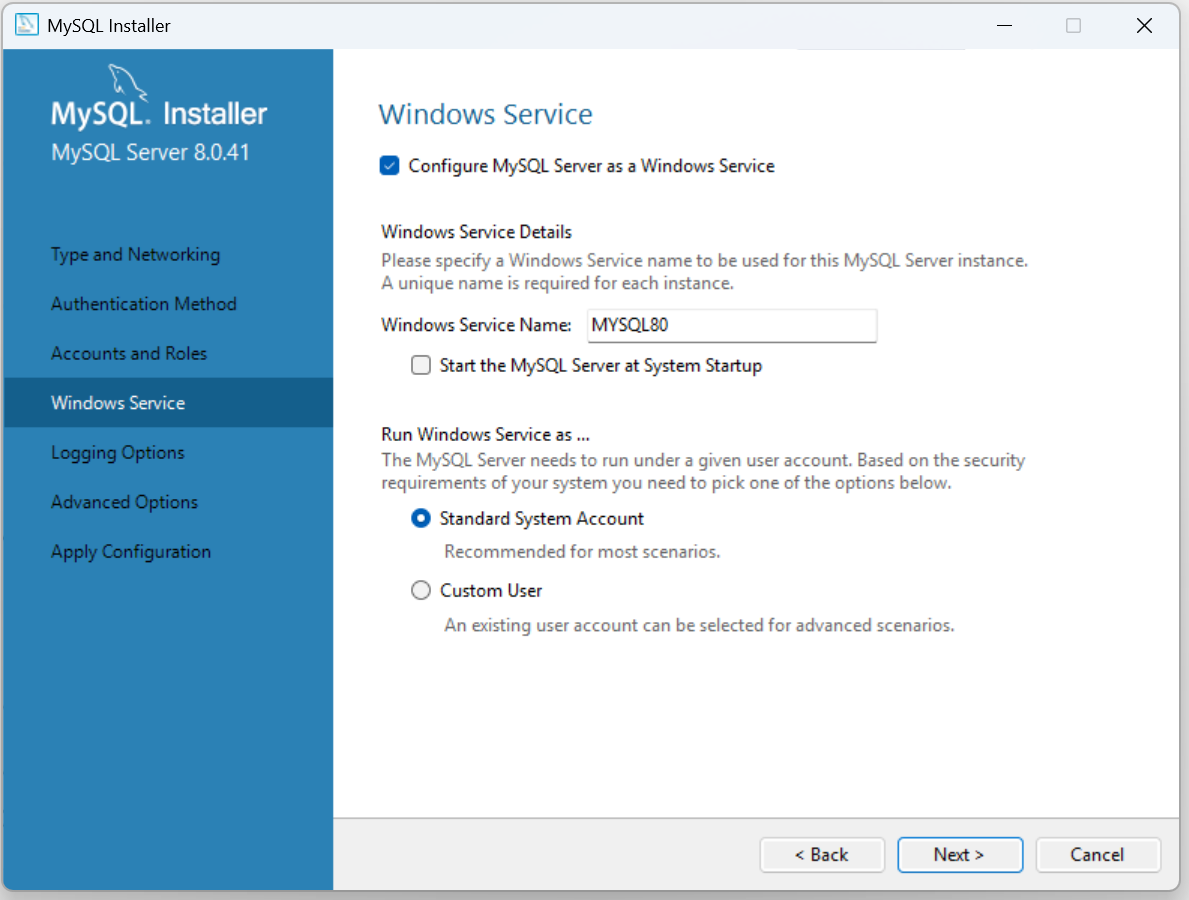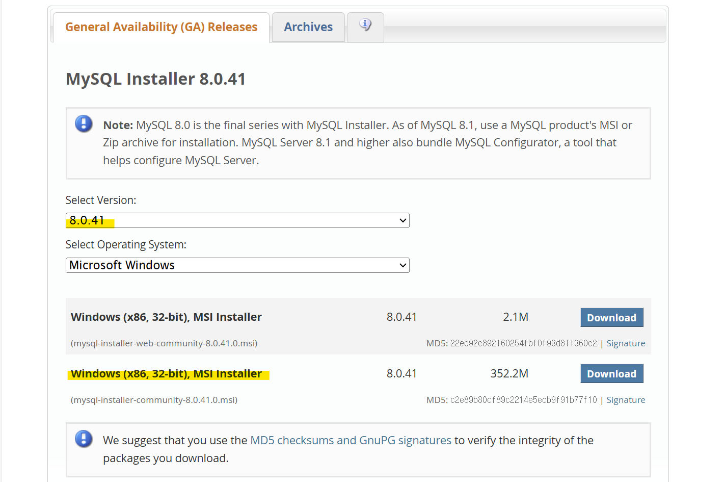MySQL Installer 8.0.41 Note: MySQL 8.0 is the final series with MySQL Installer. As of MySQL 8.1, use a MySQL product's MSI or Zip archive for installation. MySQL Server 8.1 and higher also bundle MySQL Configurator, a tool that helps configure MySQL Serve