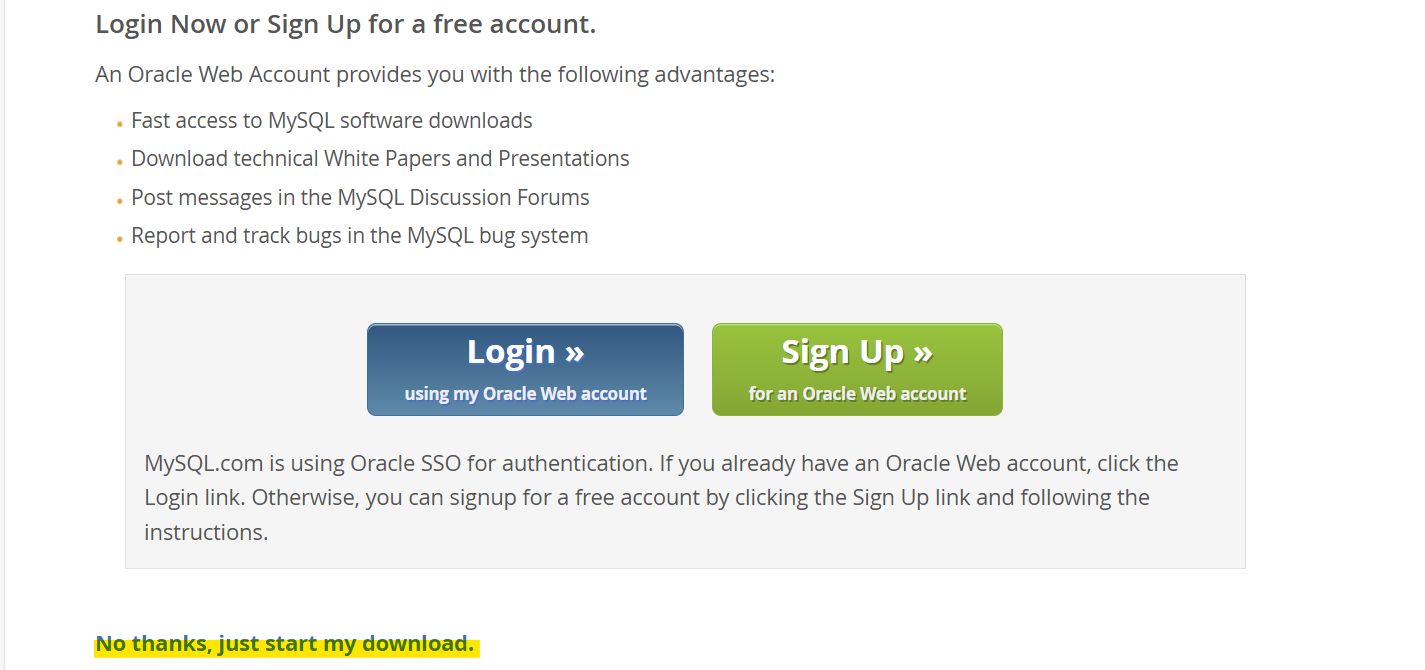 아래와 같이 로그인을 요구하는 창이 뜨면, 페이지 하단에 No thanks, just start my download 버튼을 눌러서 로그인을 하지 않고 다운로드를 진행한다. (로그인 여부는 자유이며, 해당 창은 뜨지 않는 경우도 있다.)