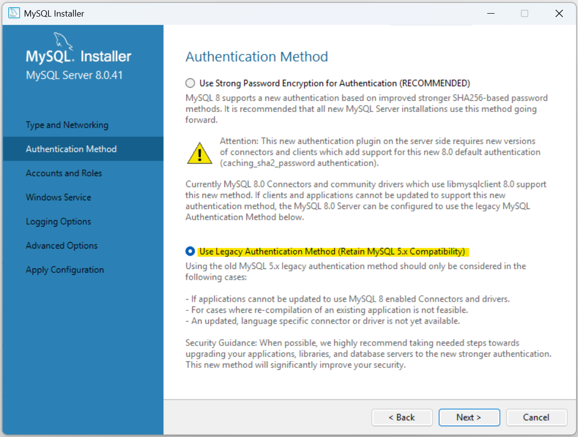 Authentication Method 파트에서는 아래 Use Legacy Authentication Method를 선택하고 다음으로 넘어간다.