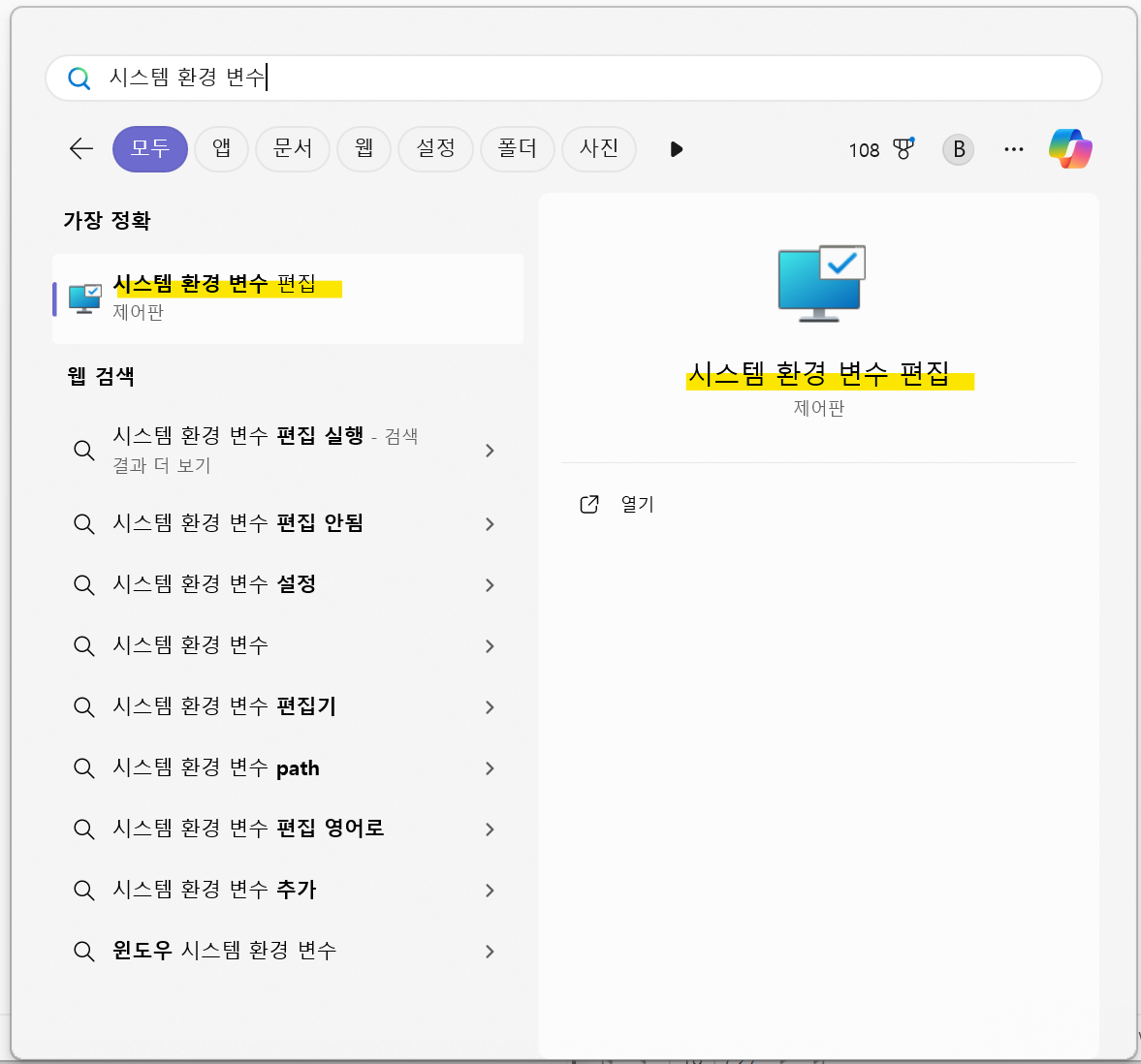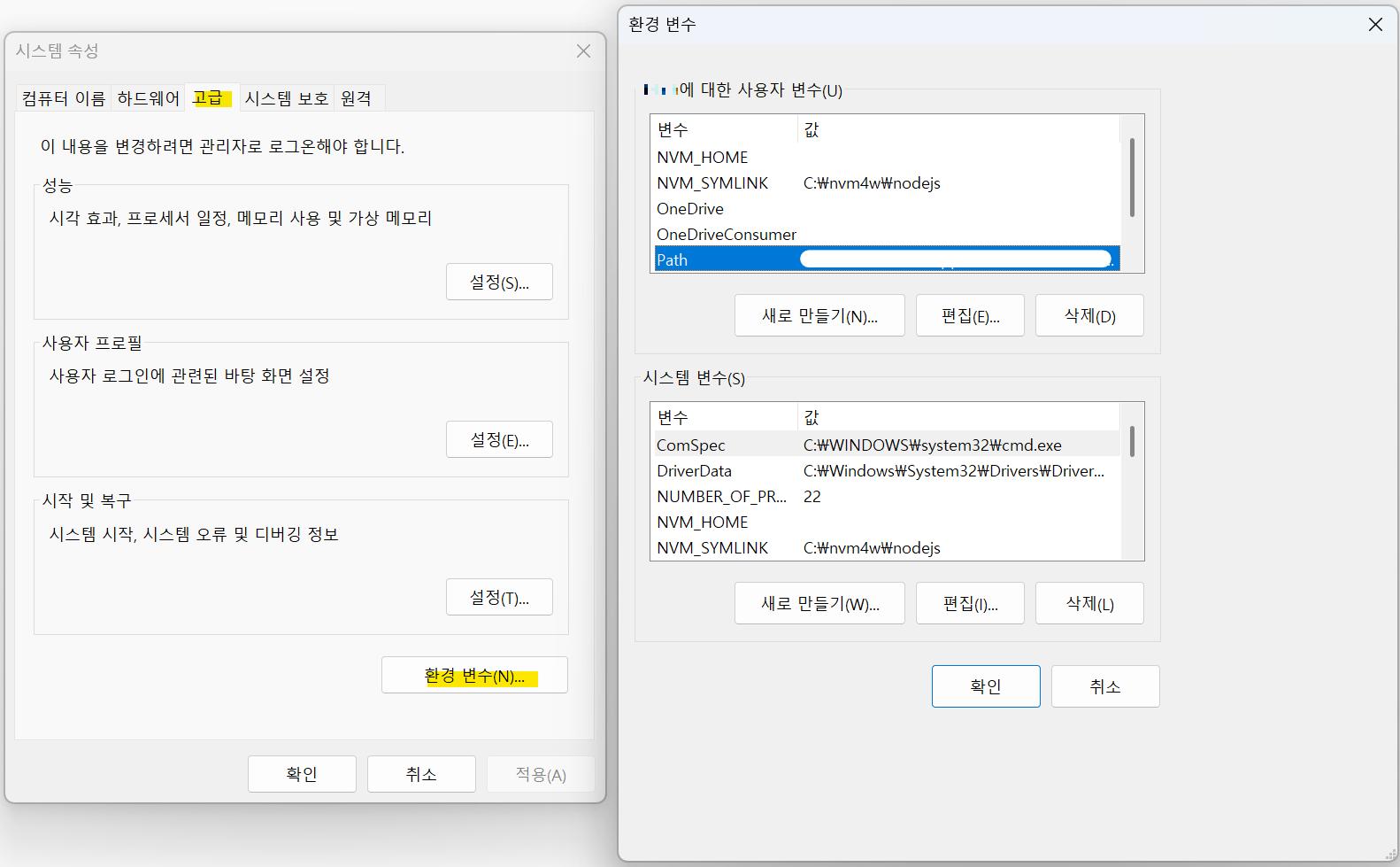 윈도우 검색에서 시스템 환경 변수 편집을 검색한 후, 시스템 속성 > 고급 > 환경 변수로 이동한다.