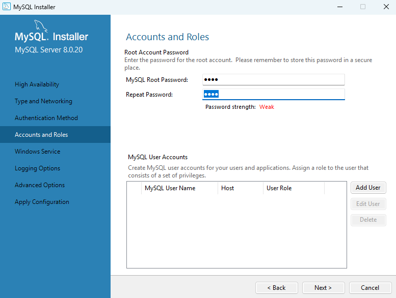 Accounts and Roles 파트에서는 기본 root 계정의 비밀번호를 설정한다. (필자의 경우 이전에 설치했던 자료가 남아 있어서인지 비밀번호를 입력하고 넘어갔고, 원래는 오른쪽 이미지와 같이 비밀번호를 설정할 수 있다.)