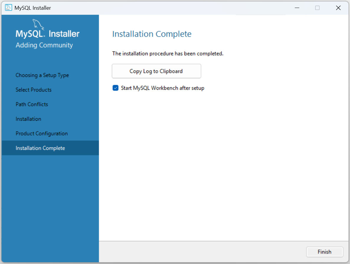 모두 완료되면 Finish 버튼을 MySQL 설정을 완료한다. 그리고 MySQL 설치도 함께 완료한다.
