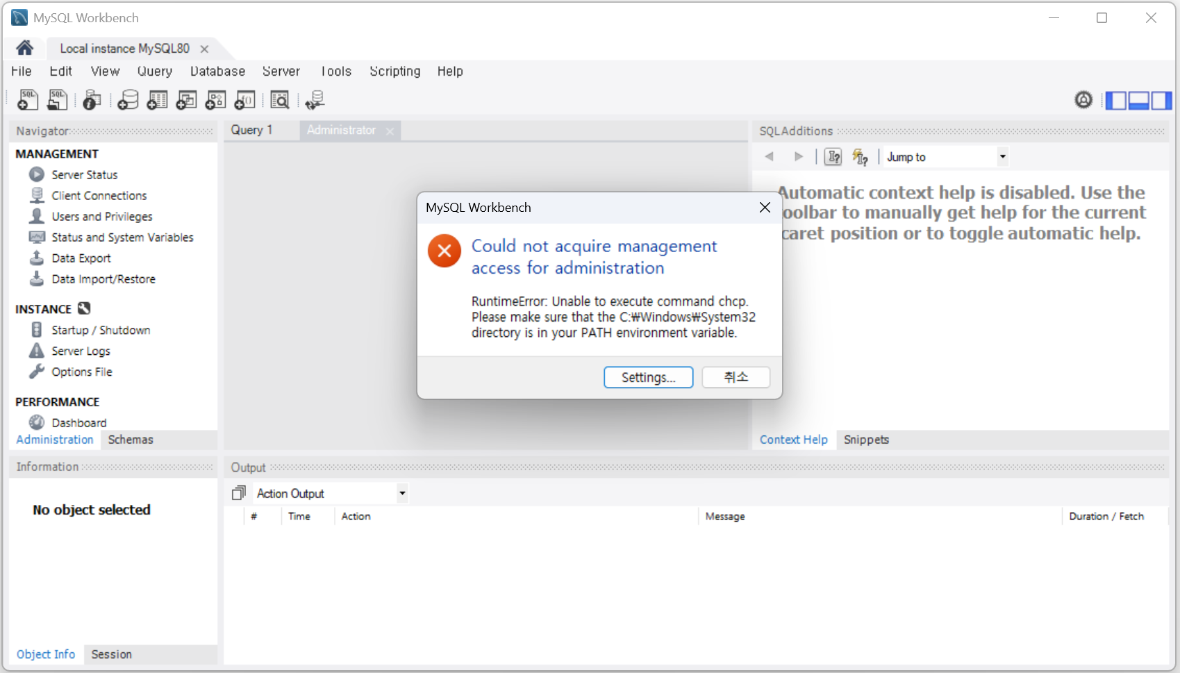 [Error] MySQL Workbench 오류 - Could not acquire management access for administration