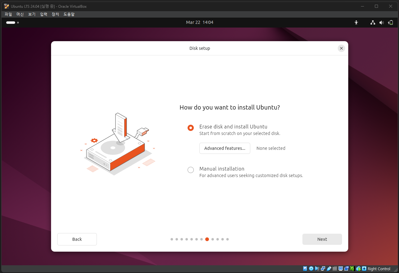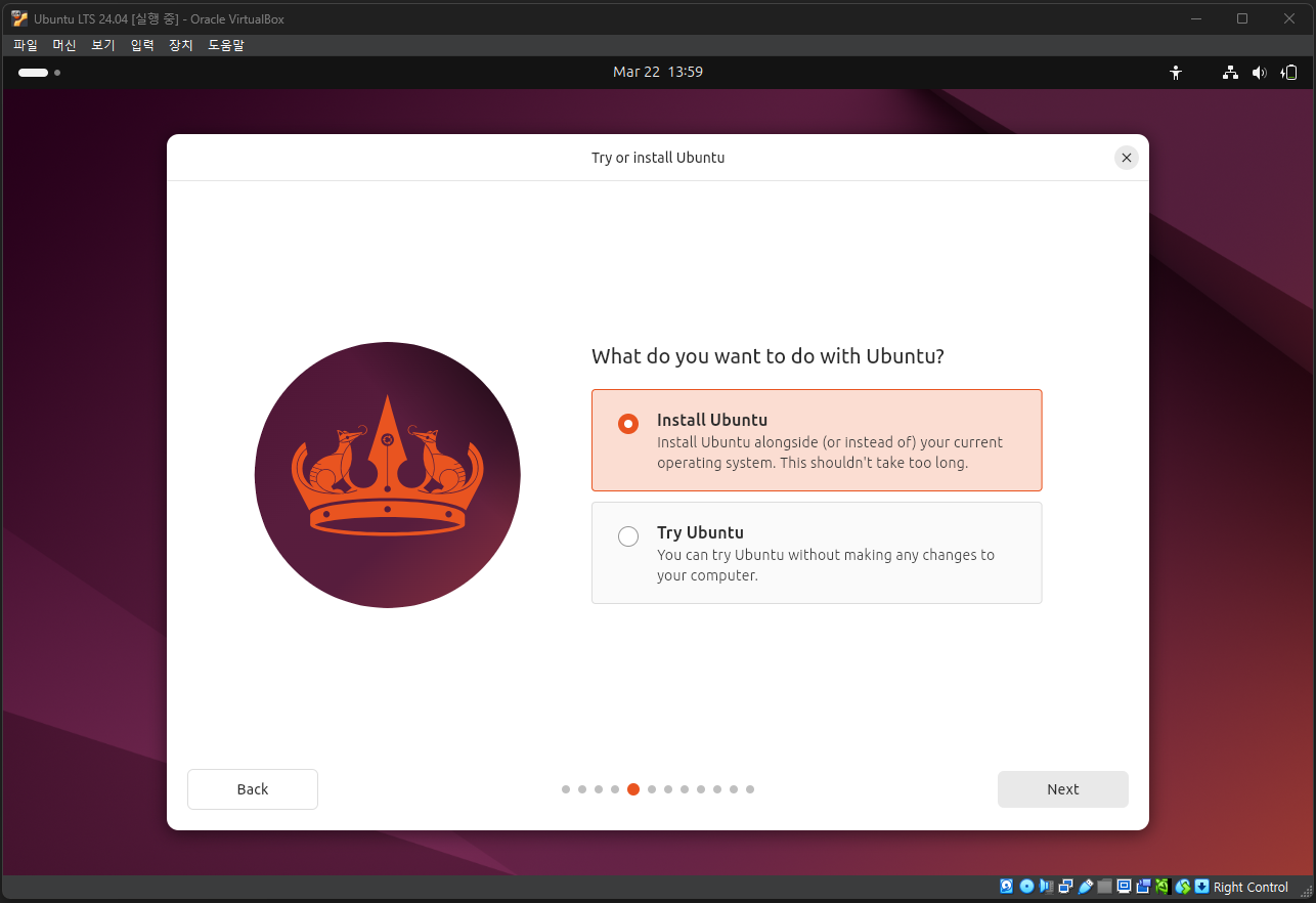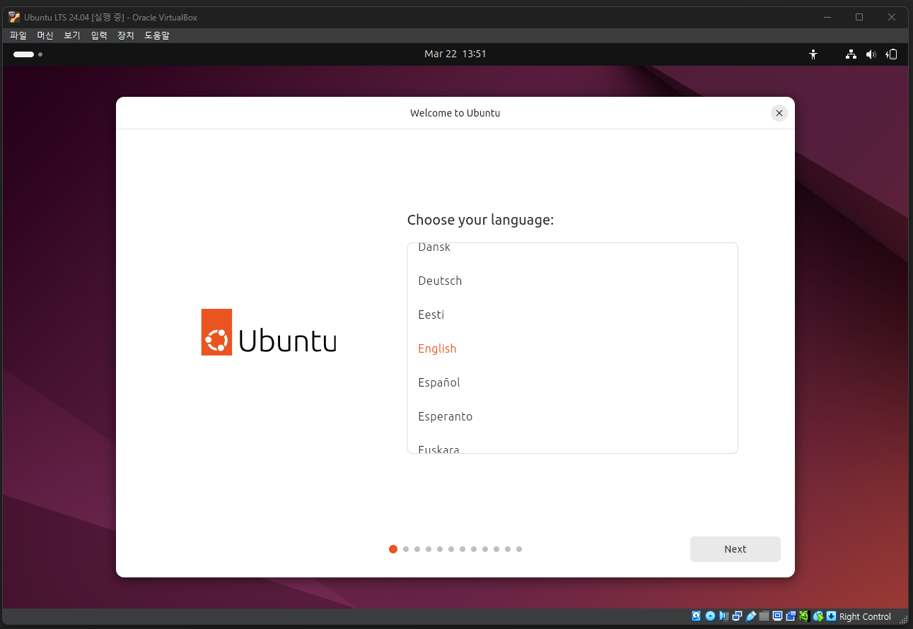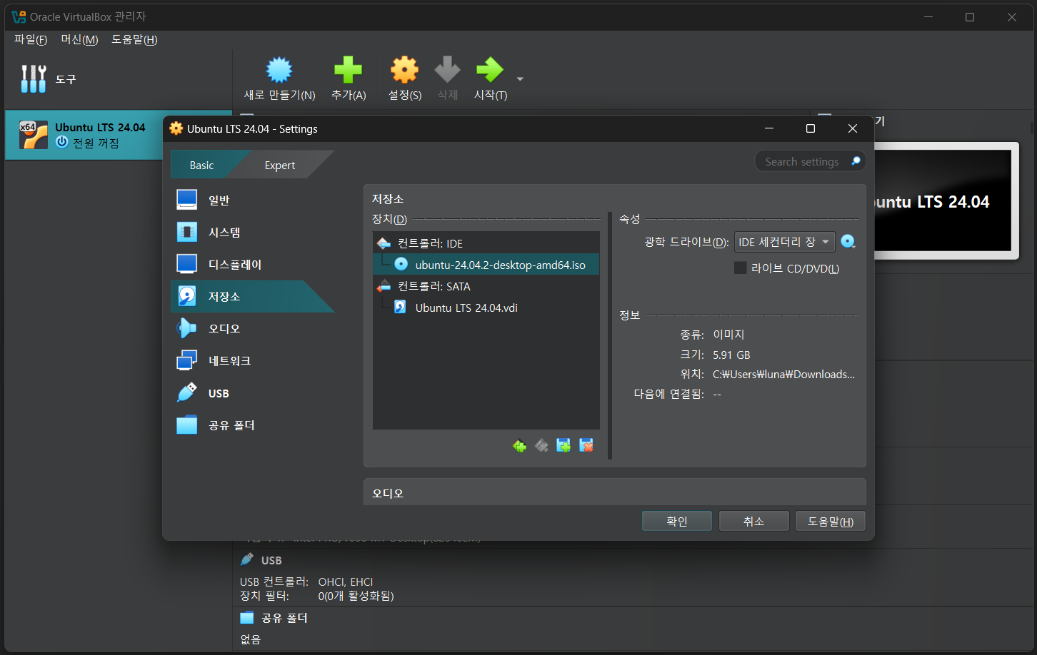 우분투 설치 파일(ISO)의 다운로드가 끝났다면, 아까 만든 가상 머신에 우분투를 설치할 차례이다. VirtualBox로 돌아와 설치 과정을 이어서 진행하자.