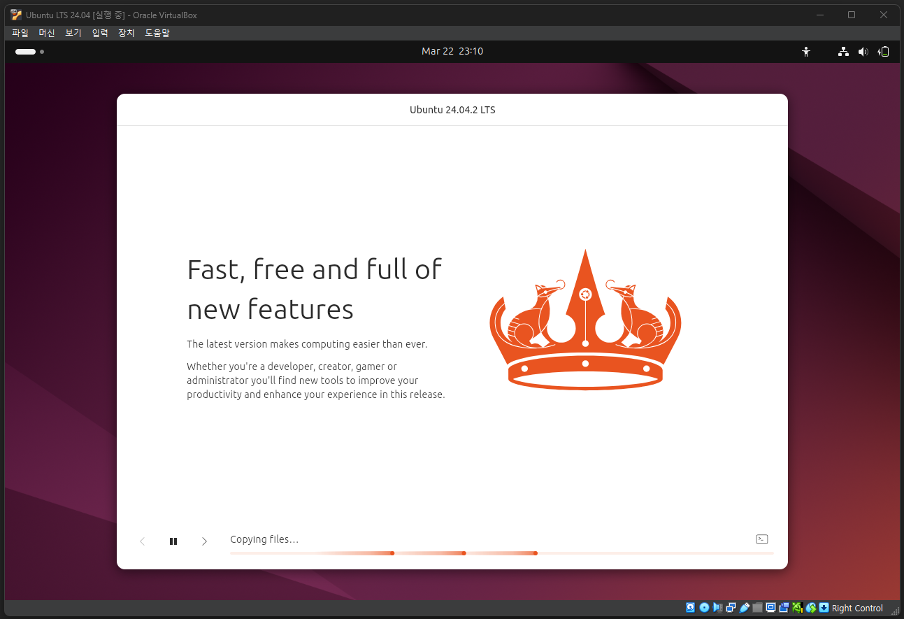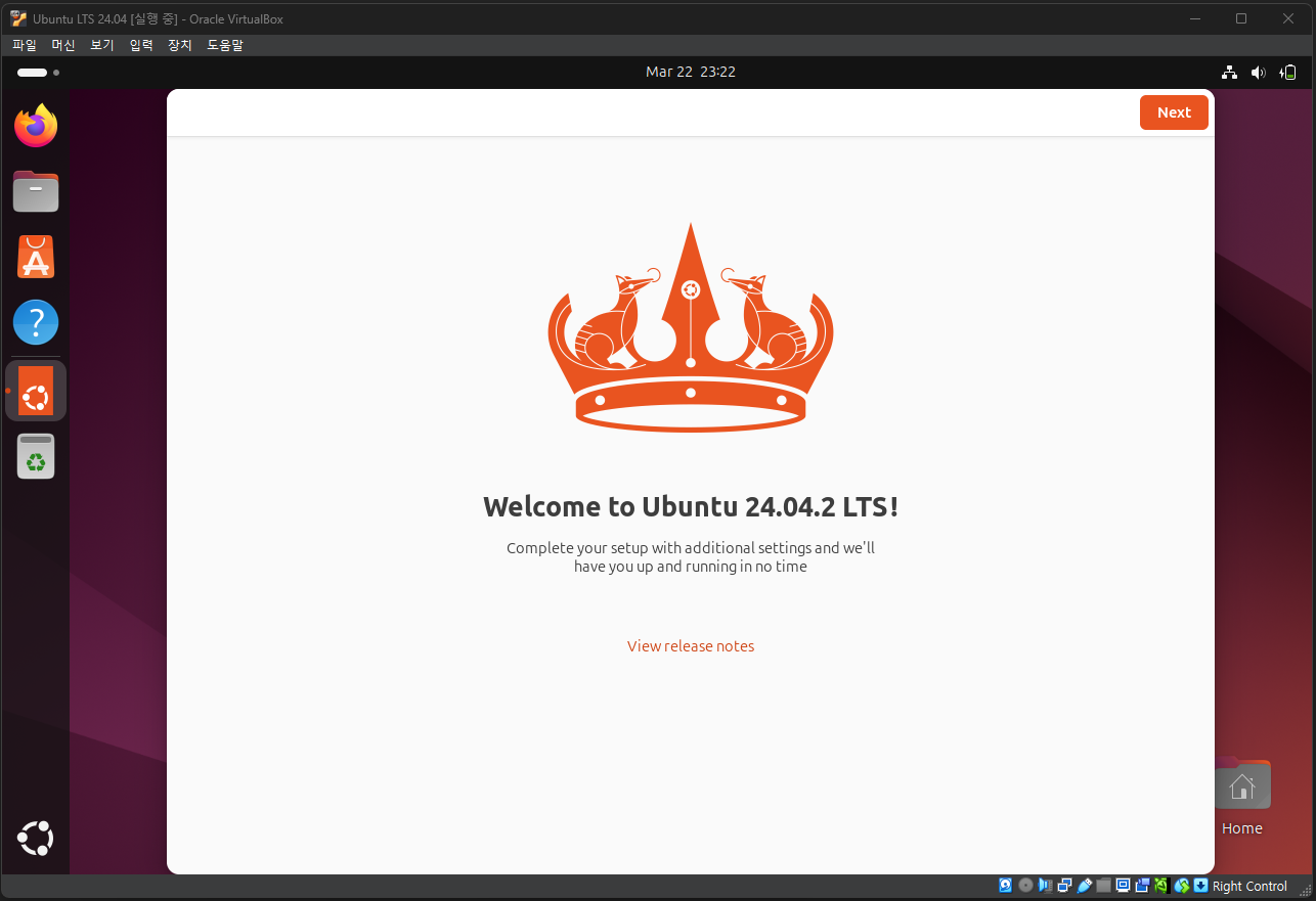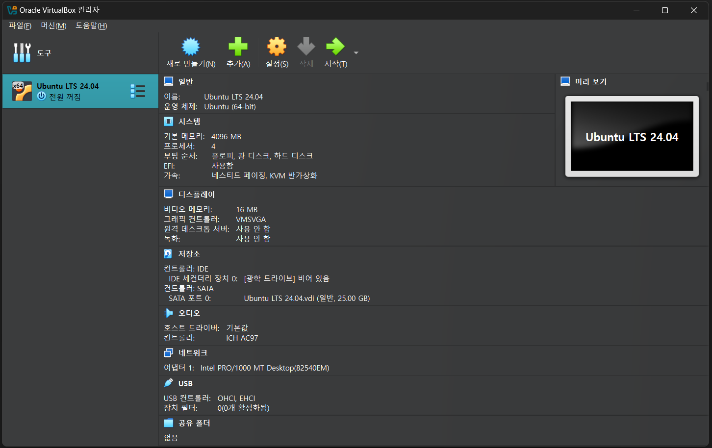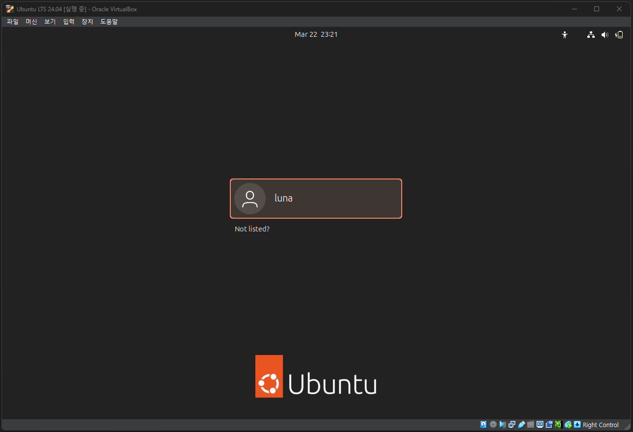 이렇게 Virtual Box를 이용한 가상 머신 생성과 리눅스 배포판 중 하나인 Ubuntu 24.04 설치를 완료하였다.