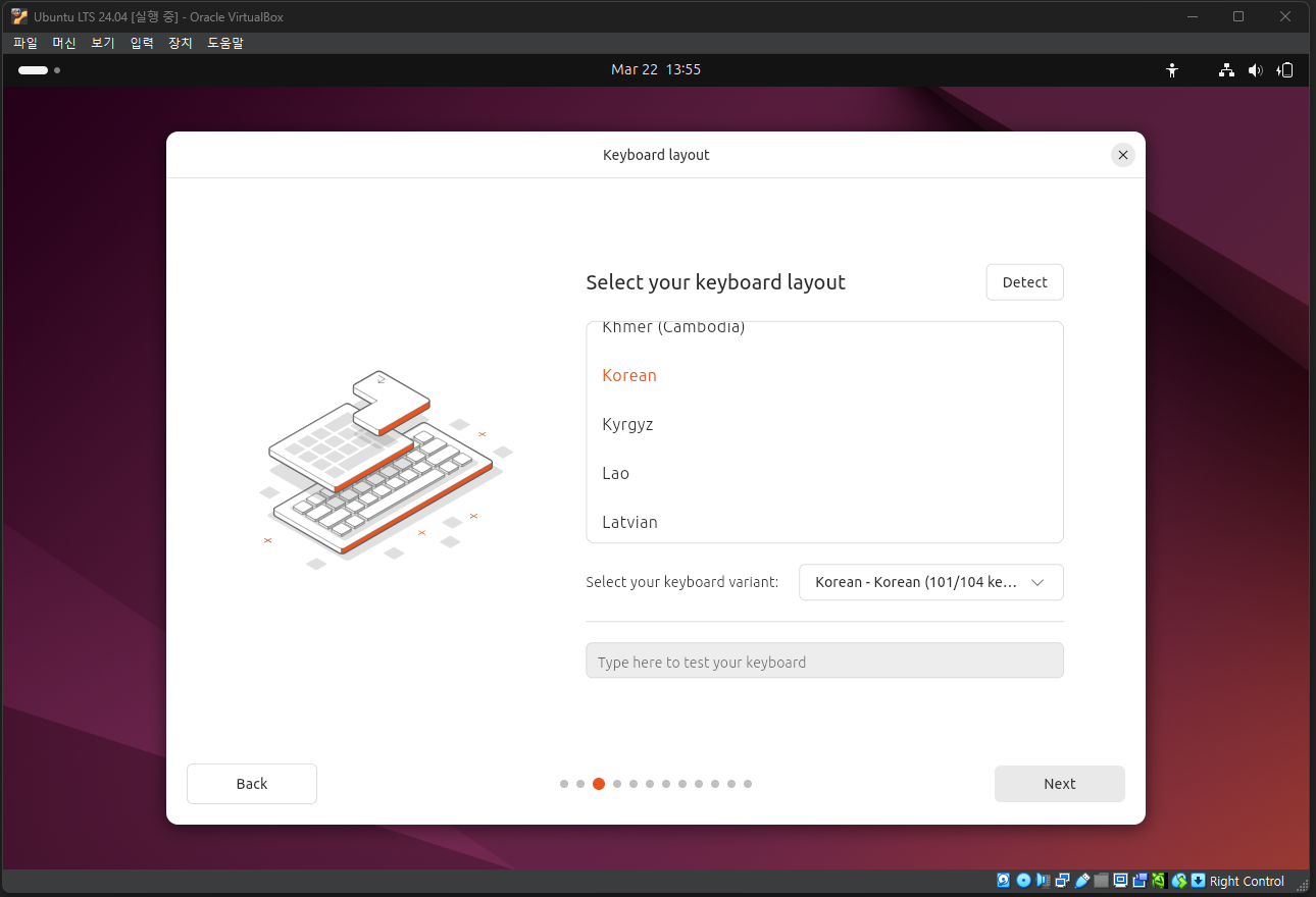 키보드는 한국어(Korean)에 101/104키로 변경하고 다음으로 진행한다. (이 부분을 한국어로 설정한다해서 한글이 입력되는 것은 아니고, 한글 입력은 설치 이후에 추가 설정이 필요하다.)