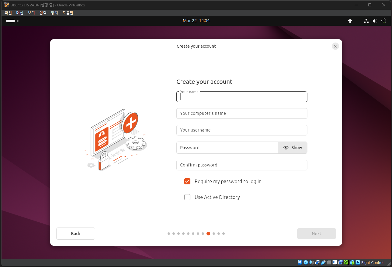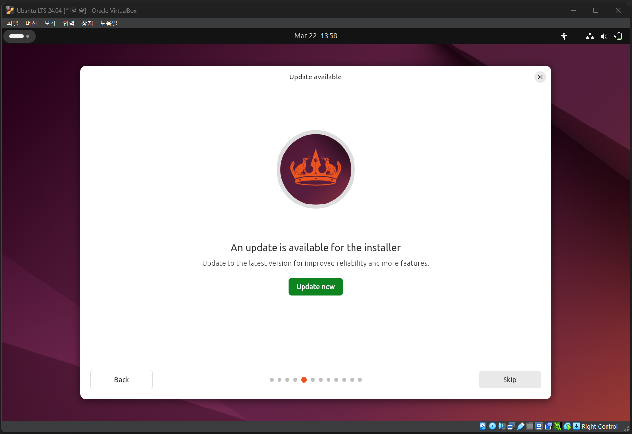 설치가 완료되었으면, Restart now 버튼을 눌러 다시 시작한다. 호스트 컴퓨터가 다시 시작되는 것은 아니고, 가상 머신에서 우분투가 꺼졌다가 다시 시작되는 것이다.