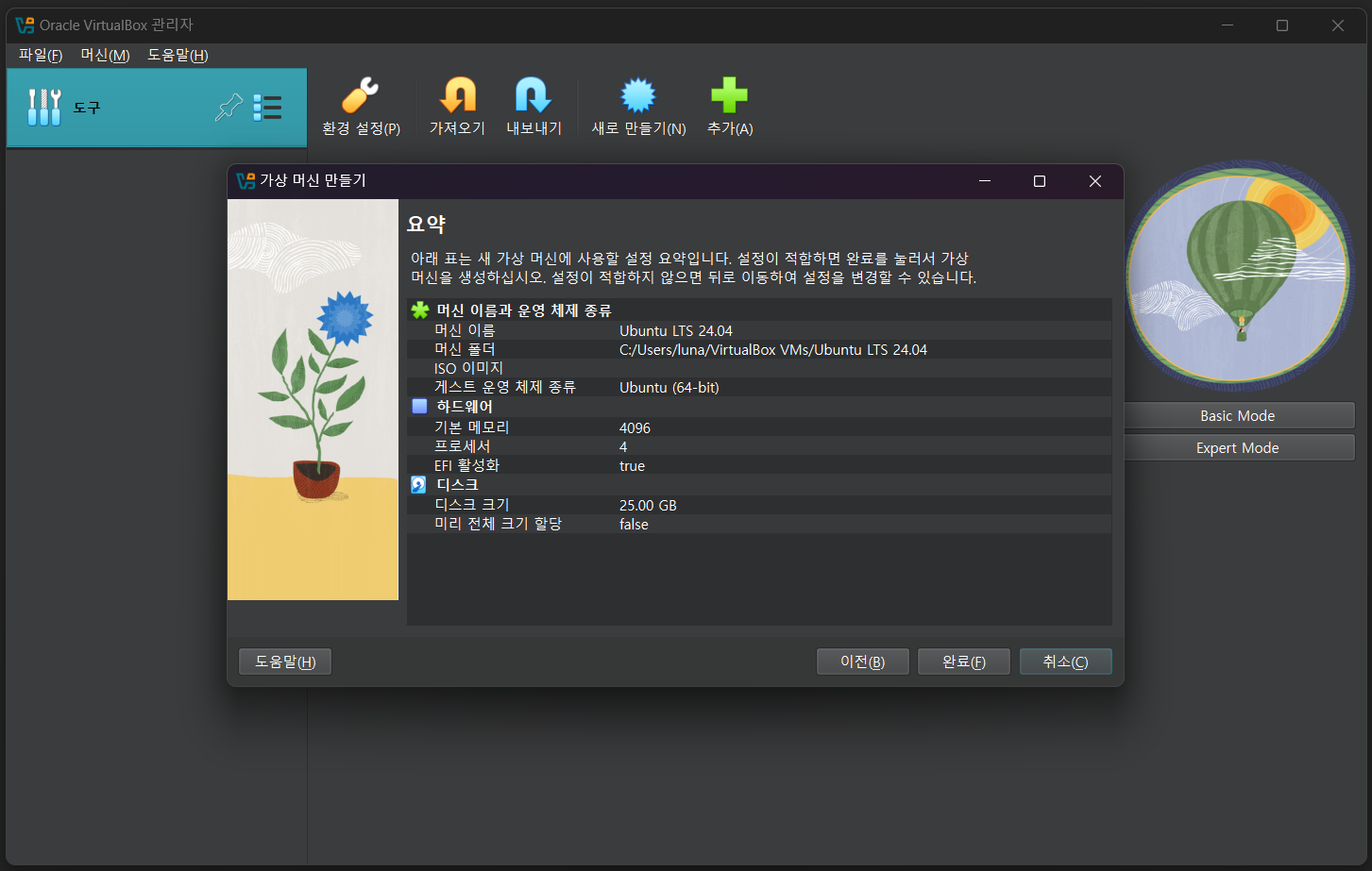 마지막으로 가상 머신 정보를 확인한 후, 완료 버튼을 누르면 가상 머신 생성이 완료된다.