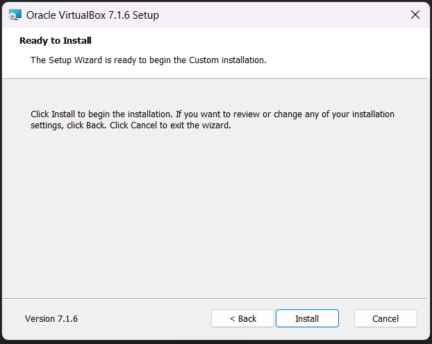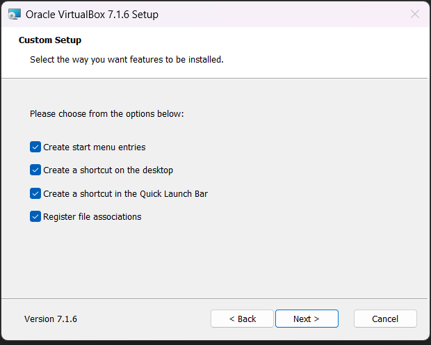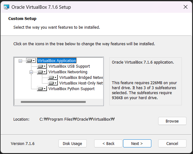 설치 프로그램을 실행하여 VirtualBox를 실행한다. 설치 과정 중 어려운 부분은 없기 때문에 생략한다. (이미지로만 대체)