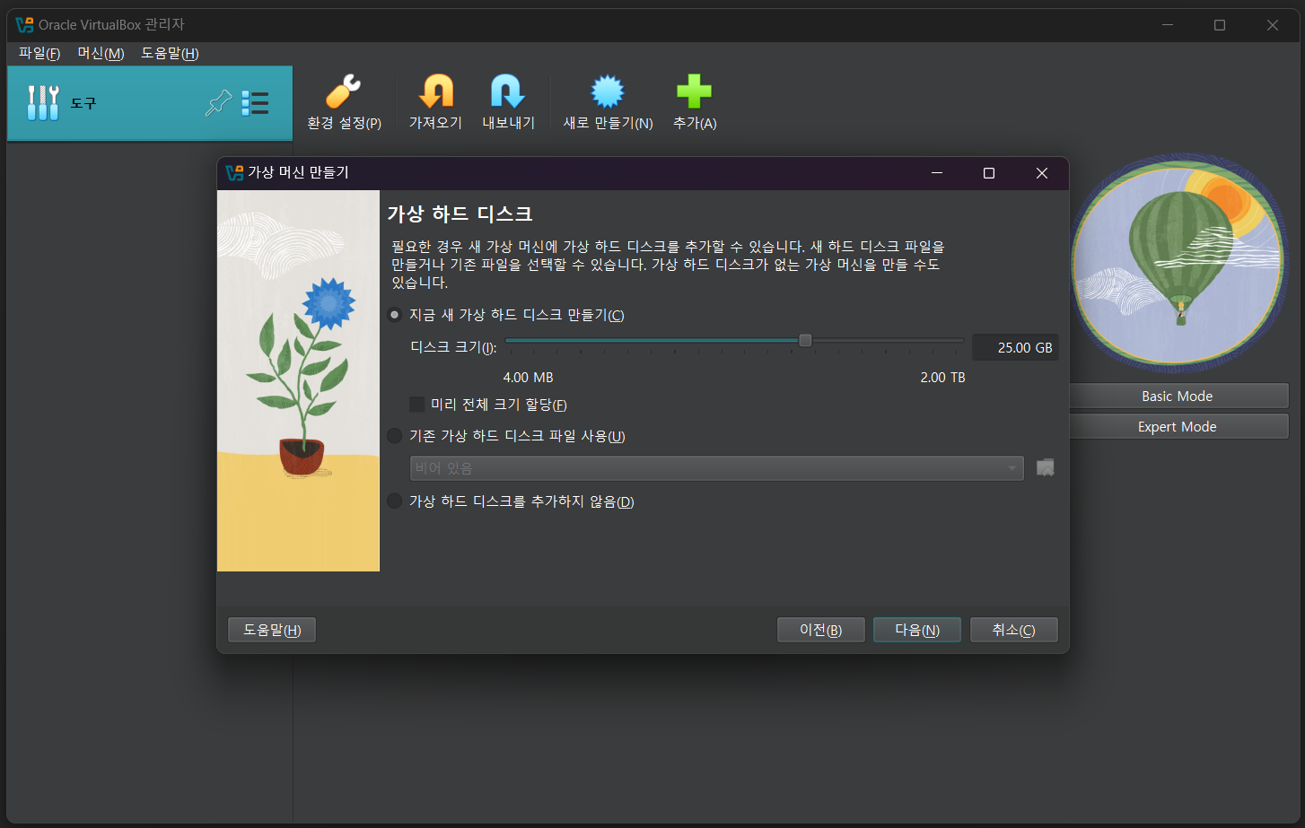 하드디스크 용량 역시 본인의 컴퓨터 하드웨어 용량에 따라 적당히 선택한다. 본인이 설치하고자 하는 운영체제에서 요구하는크기 이상으로 설정하되, 용량을 너무 크게 설정하면 Windows에서 사용할 용량이 부족할 수 있으므로 신중하게 결정한다. (필자는 Ubuntu LTS 24.04.2의 요구 사항인 25GB로 설정하였다.)