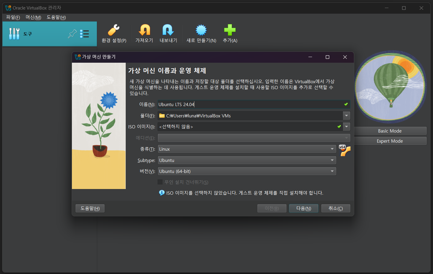 새로 만들기를 클릭하고, 가상 머신의 이름을 작성한다. 운영체제 이름이 포함되도록 가상머신의 이름을 정하면 하단에 종류, Subtype, 버전이 모두 자동으로 선택되지만, 만약 선택이 되지 않았다면 본인이 설치하고자 하는 운영체제에 맞춰서 설명한다. (ISO 이미지는 Ubuntu를 설치할 때 진행할 예정이다.)