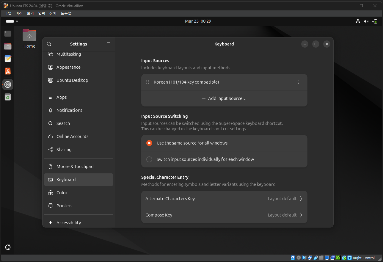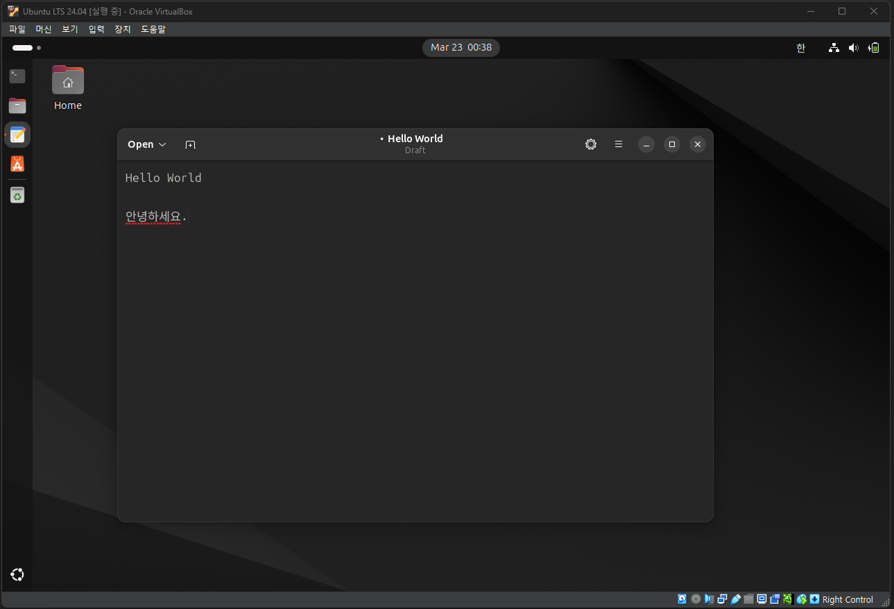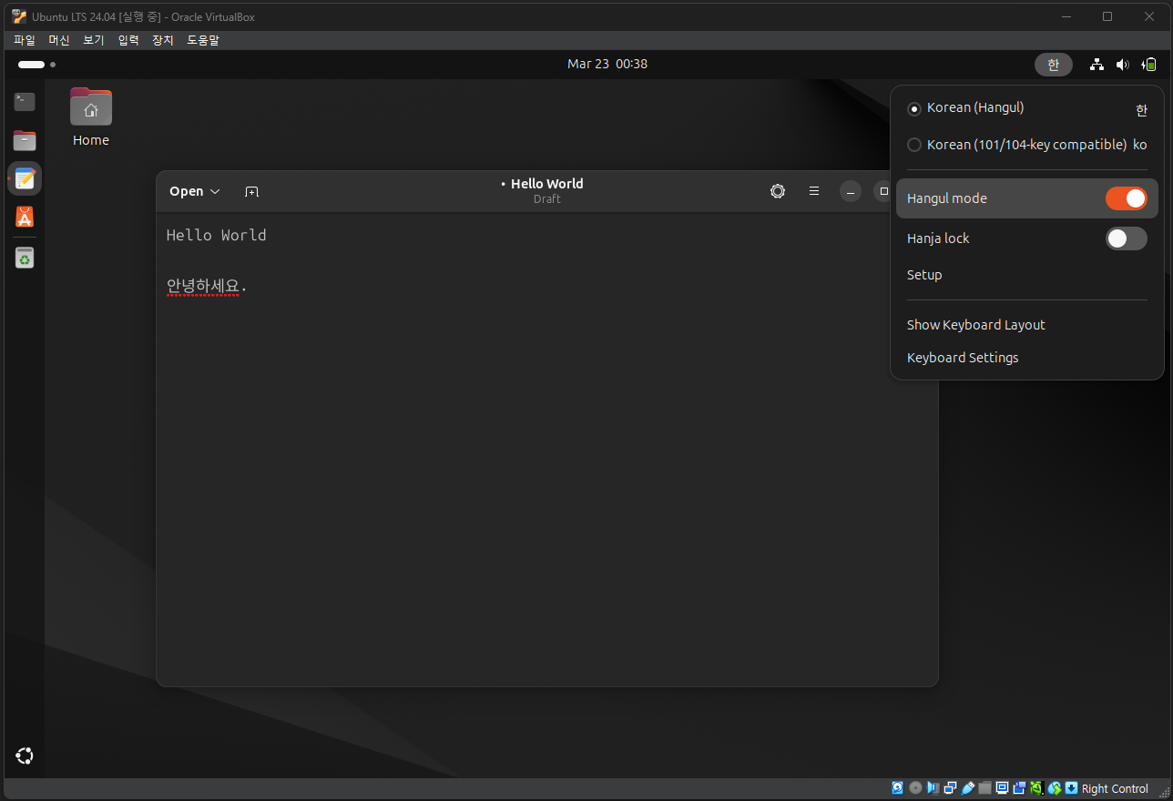 만약, 한글 입력이 안된다면 우측 상단에 있는 언어 아이콘을 클릭하고 Korean(Hangul)이 선택되어 있는지 확인한 후, 다시 테스트를 진행한다.
