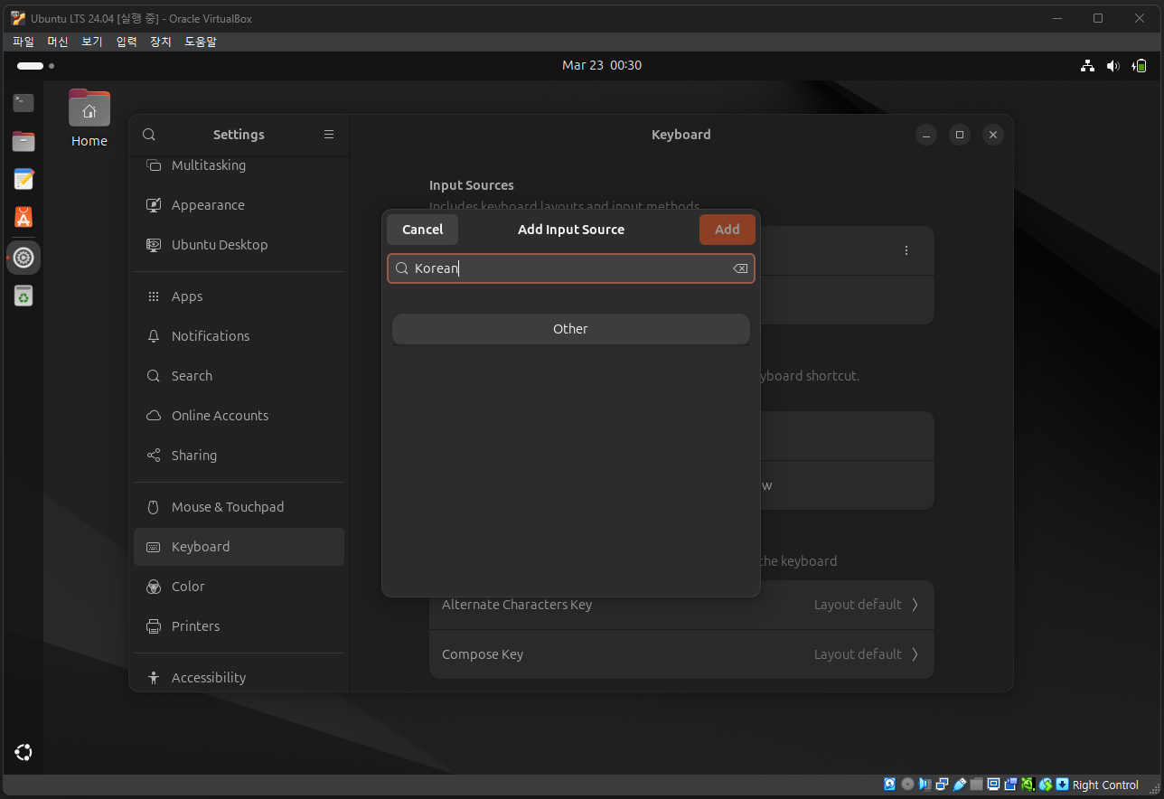 Add Input Source를 누른 후, ... 버튼을 누른다. 그리고 Korean을 검색한 후, Other를 누른다.