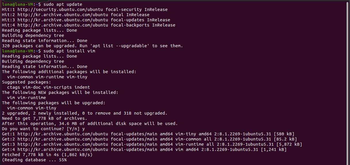 먼저 sudo apt update로 패키지 리스트를 최신화 한 후, 아래 명령어로 Vim을 설치한다.