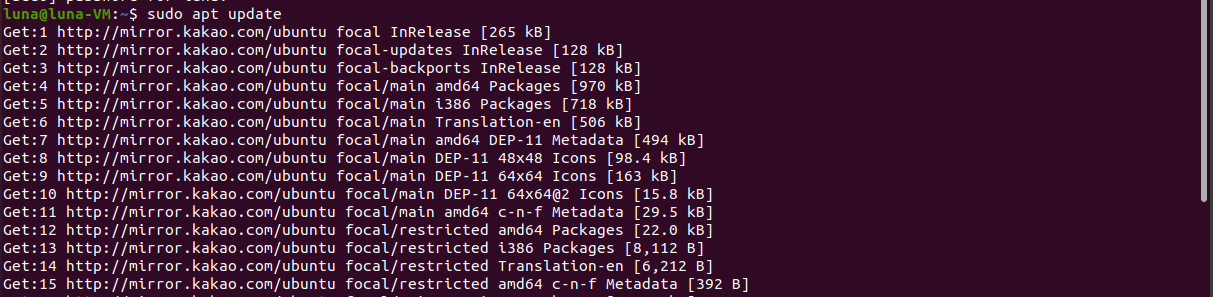 그리고 sudo apt update로 패키지 목록(정보) 업데이트를 진행한다. 업데이트가 정상적으로 진행됨과 동시에 서버 주소가 mirror.kakao.com에서 받아오면 성공적으로 변경된 것이다.
