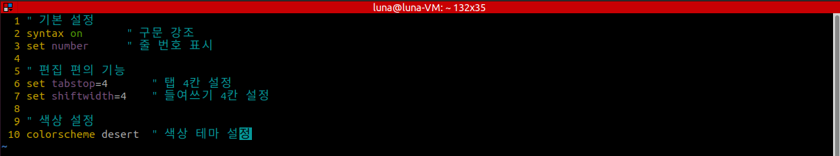 :set encoding=utf-8:set fileencodings=uft-8, euc-kr:colorscheme desert: 색상 테마 설정 (기본 제공 테마 중 선택)- 적용 가능한 기본 테마의 종류는