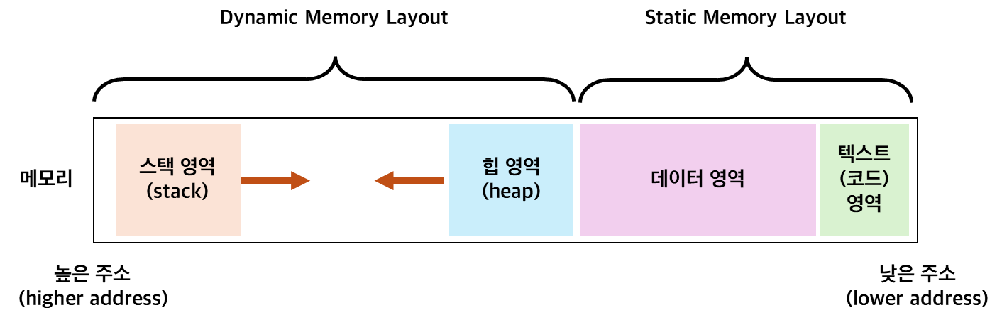 - 운영체제와 컴파일러가 프로그램이 시작될 때, 변수들이 사용할 메모리 영역을 배정 ➡️ C언어의 코드 레벨에서는 개발자가 구체적으로 메모리 주소를 결정하지 않음