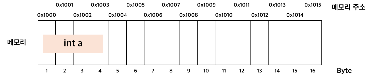 - 변수가 선언되면, 해당 변수는 메모리 어딘가에 자료형의 크기만큼 공간을 차지하고 값을 저장하고 있음
