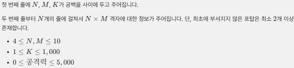 N,M,K: 기본적인 맵 및 게임 정보 (각각 세로, 가로, 최대 턴)remain_tower: 살아있는 포탑의 개수 (모든 턴이 끝나기 전에 종료 체크를 위함)vector<vector<Tower>> map: 포탑 배치 지도 + 각 포탑 정보(구조체)를 담을 배열vector<bool> isdestroy: 포탑 파괴 여부 (ID 기반으로 동작하는 DAT, 탐색 시간 줄이기 위함)vector<vector<int>> visited: BFS 탐색을 위한 방문 체크 배열 (방문 체크 겸 최단 거리 탐색)vector<Tower> path: BFS 탐색 경로 저장용vector<bool> isAttack: 공격 관여 여부 (ID 기반 동작 DAT, 공격자, 타겟, 공격 맞은 다른 포탑들)