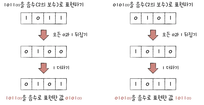 - 2의 보수 : 어떤 수를 그보다 큰 $ 2^n $에서 뺀 값 (ex.