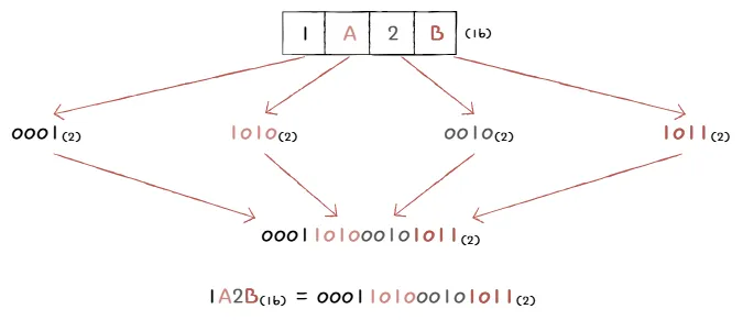 - 십육진수 한 자리당 4 비트의 이진수로 표현 가능 ➡️ 각 자리를 4 비트의 이진수로 변환하여 그대로 이어 붙여서 변환