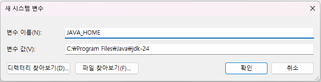 시스템 변수의 새로 만들기를 누르고 아래와 같이 입력한다. (설치 경로 변경을 하지 않았다면 아래와 경로가 같을 것이고, 만약 경로를 변경했거나 버전이 달라졌으면 경로가 달라졌을 것이다. 본인이 설치한 파일 경로를 확인해야 한다.)