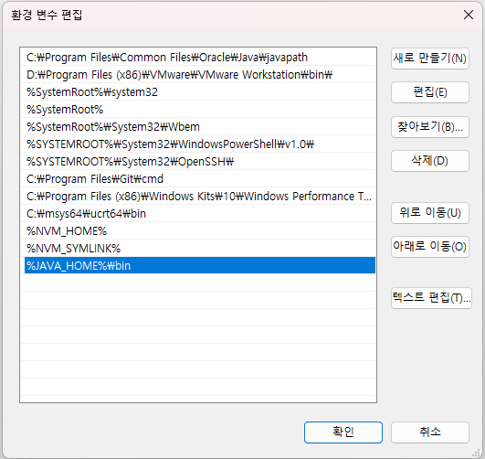 그리고 시스템 변수의 Path를 선택한 후 편집을 누른다. 그리고 %JAVA_HOME%\bin을 입력한 후 확인을 클릭한다.