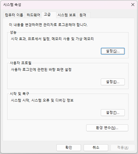 JDK 설치가 완료되었으면 이제 Java 환경 변수 설정을 진행한다. 시스템 환경 변수 설정 창을 열여준다.