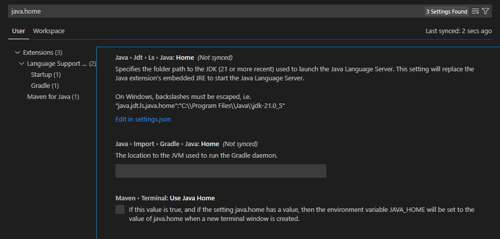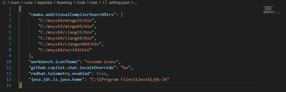 Edit in settings.json을 누르, java.home 부분에 JDK 설치 경로를 입력한다. 윈도우에서 설치 경로는 대부분 백슬래시(\)가 한개로 입력되는데, 하나씩 추가해서 2개씩 입력해주면 된다.