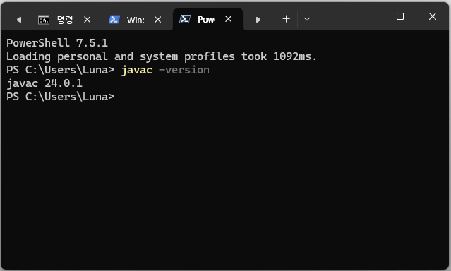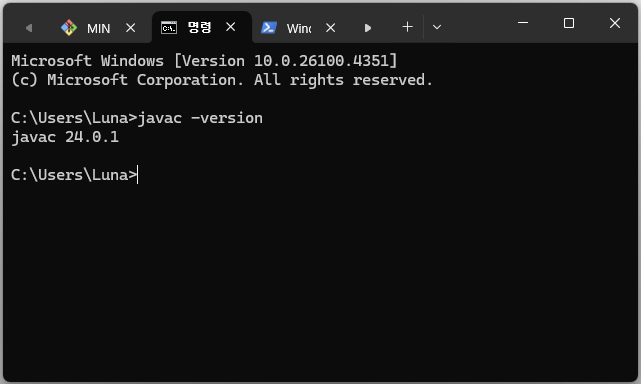 명령 프롬프트(cmd)를 실행해서 javac -version을 입력후 실행한다. 버전이 정상적으로 출력되면 잘 설치가 된 것이고, 만약 오류가 발생하면 설정이 빠진 부분이 있는지 다시 검토한다.