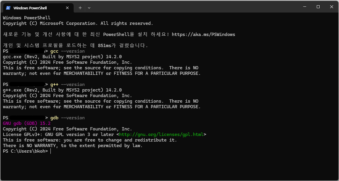 환경 변수로 경로 추가를 완료하였다면, 터미널을 열고 아래 명령어를 실행해 정상적으로 실행되는지 확인한다. 아래 이미지와 같이 해당 컴파일러 및 디버거의 버전이 뜨면 정상적으로 설치가 완료된 것이다.