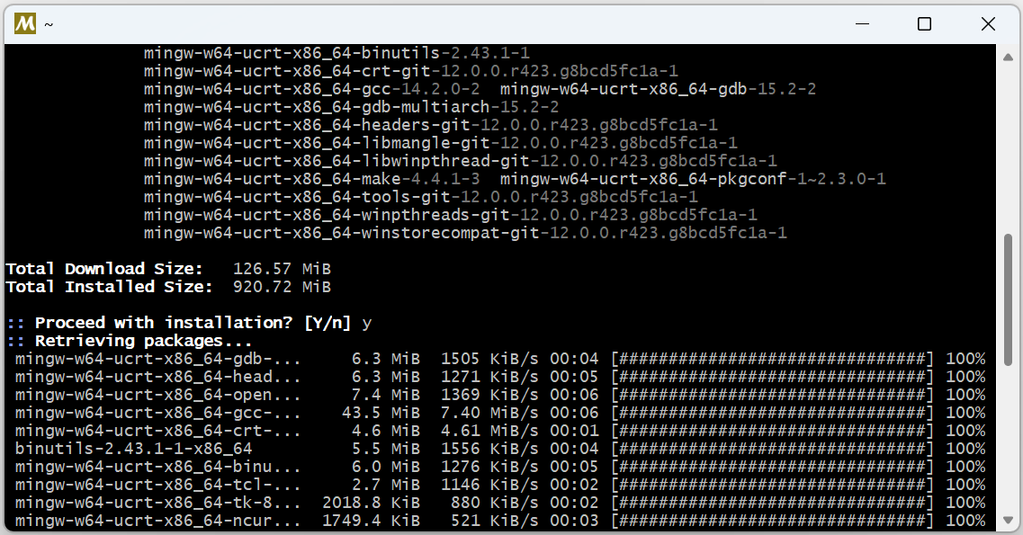 터미널이 실행되면, 아래 명령어를 입력해 MinGW-w64 toolchain을 설치한다.