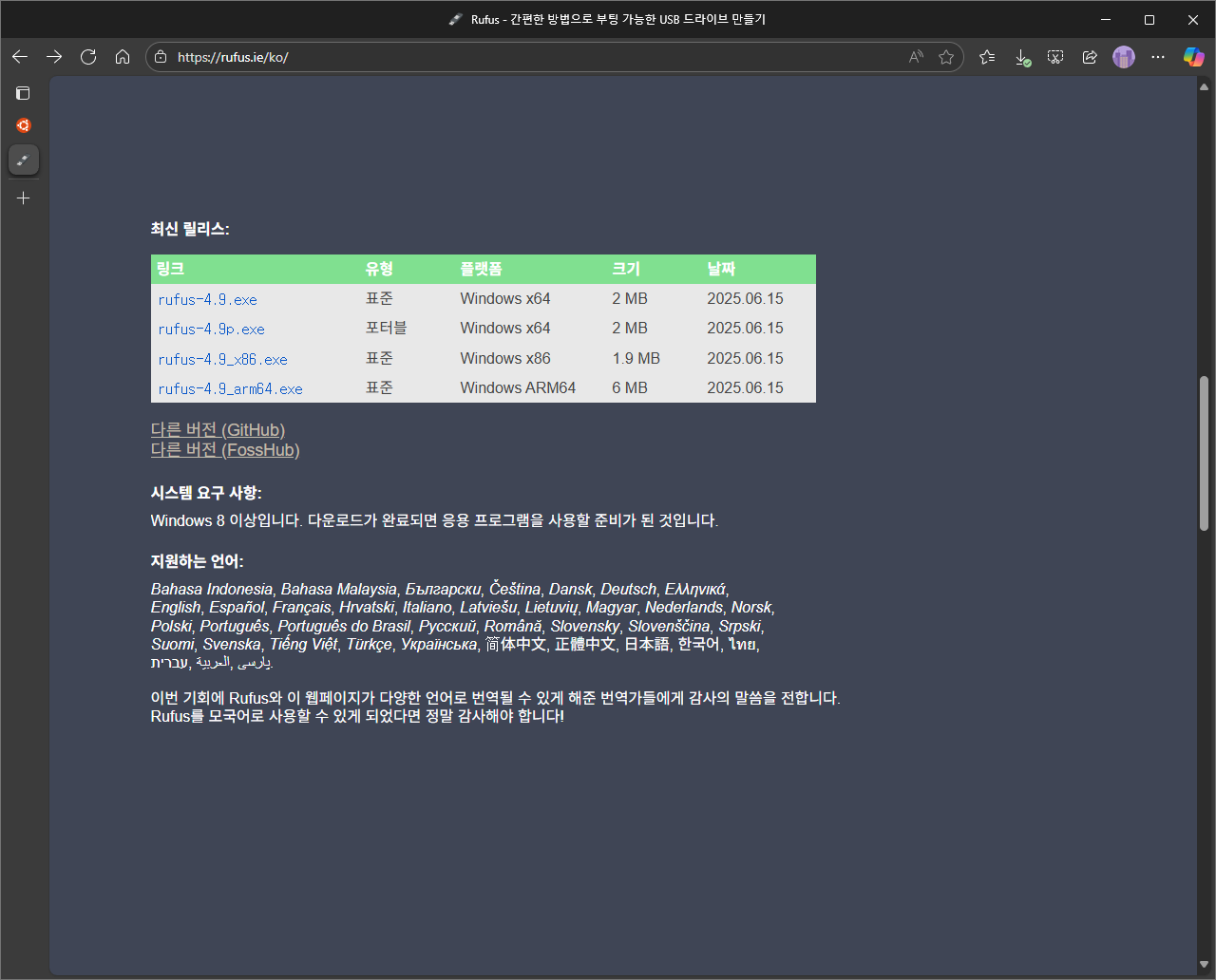 여러 프로그램이 있지만, 이 글에서는 Rufus라는 프로그램을 사용할 것이다. 아래 링크로 이동해 Rufus를 다운받는다.
