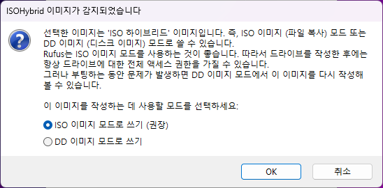 만약 아래와 같은 메세지가 뜨면, ISO 이미지 모드로 쓰기를 선택하고 OK를 누르면 된다.